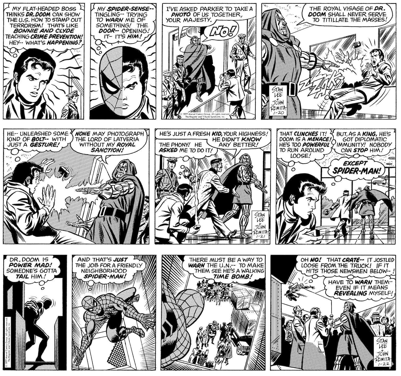 1977 kicks off as J.Jonah Jameson invites none other than Doctor Doom, the iron-fisted ruler of Latveria, to address the U.N.—and it’s up to Spider-Man to stop him from blackmailing the world’s leaders! From there, the wall-crawler faces off against a rogues’ gallery of iconic foes, including Doctor Octopus, the Kingpin, and Kraven the Hunter. Plus, the debut of an all-new villain: The Rattler!
